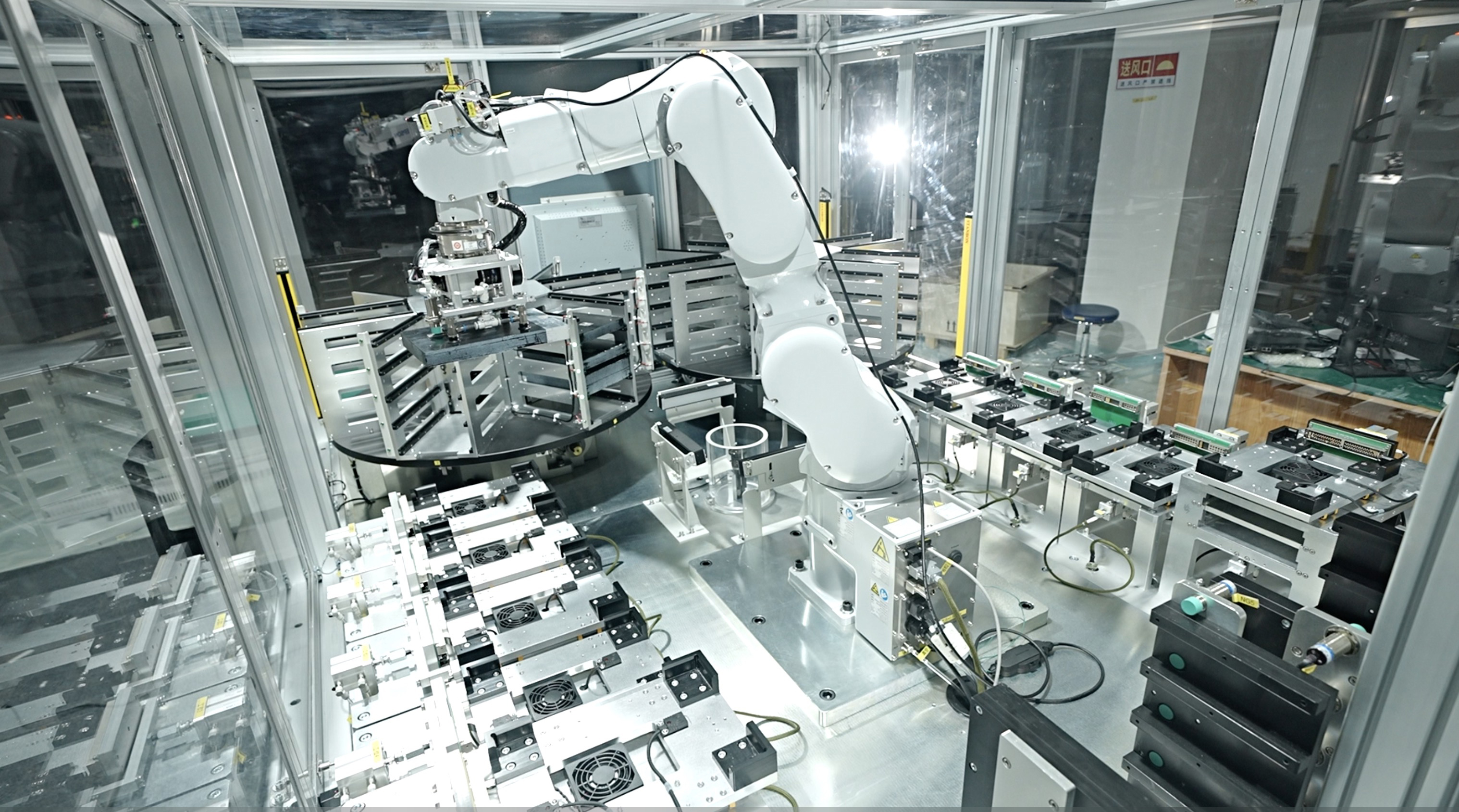 采用“旋轉(zhuǎn)式料倉(cāng)+環(huán)繞式工位布局”的方案,結(jié)構(gòu)空間緊湊,搭載高精度工業(yè)機(jī)器人,融合視覺(jué)系統(tǒng)和力覺(jué)系統(tǒng),實(shí)現(xiàn)了上料轉(zhuǎn)臺(tái)模塊抓取、條碼視覺(jué)識(shí)別、放置測(cè)試工位、氣缸自動(dòng)夾持、連接器插拔、性能測(cè)試、模塊下料、產(chǎn)品分選的全流程自動(dòng)流轉(zhuǎn)。