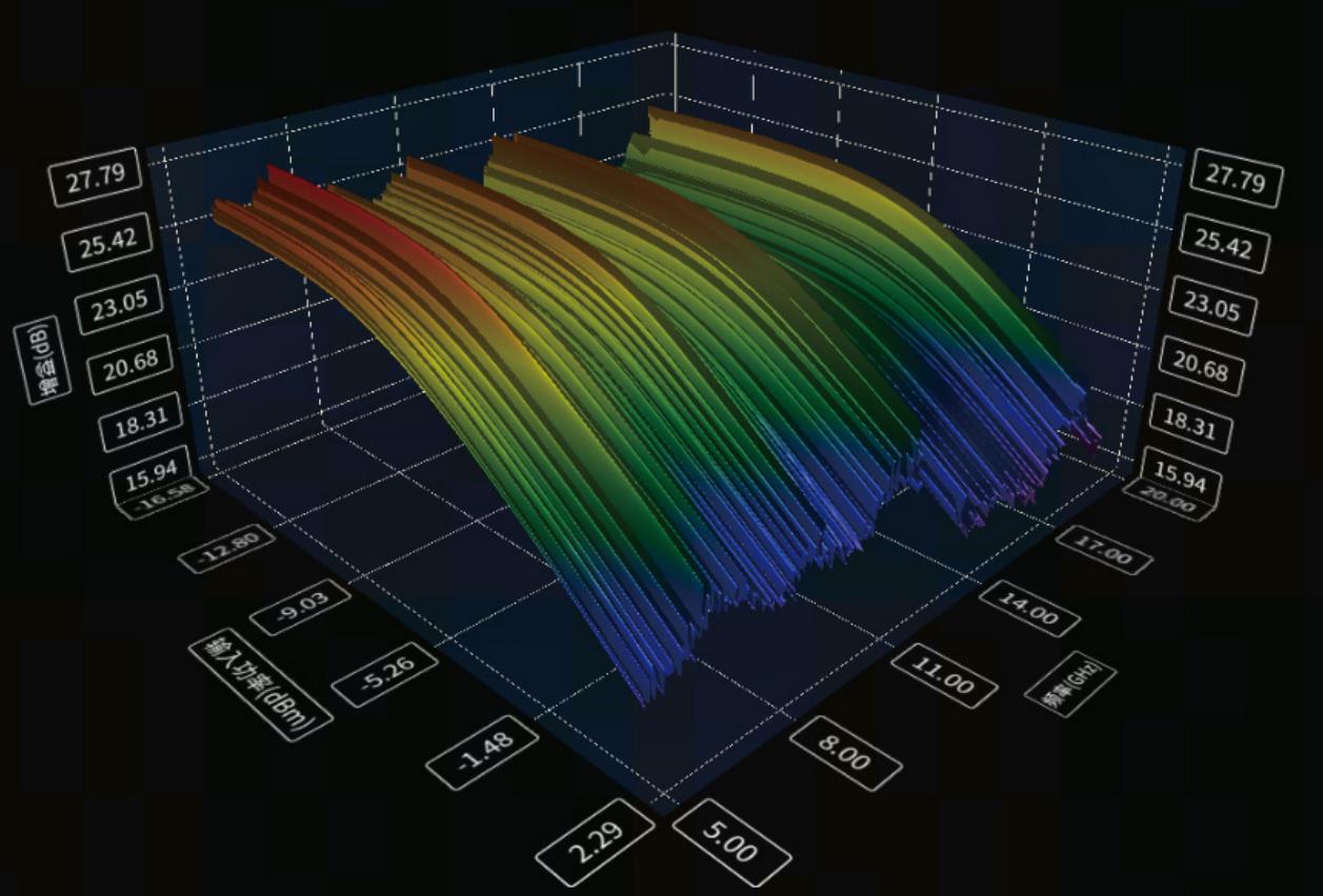 提供三維視圖功能,更好地展示被測件在激勵狀態(tài)下的工作性能,另外還可以展示頻率切面和功率切面,可以直觀展現(xiàn)被測件在每個頻率點和每個功率點的特性。