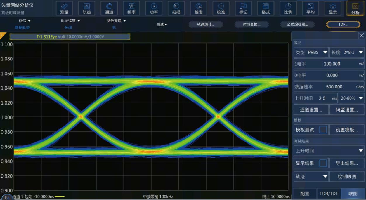 高級時域分析選件具備基于網(wǎng)絡(luò)參數(shù)的虛擬眼圖生成及分析功能。根據(jù)不同的高速數(shù)字通信標(biāo)準(zhǔn),高級時域分析選件可以使用預(yù)先定義好的眼圖模板進行高效率Pass/Fail測試。