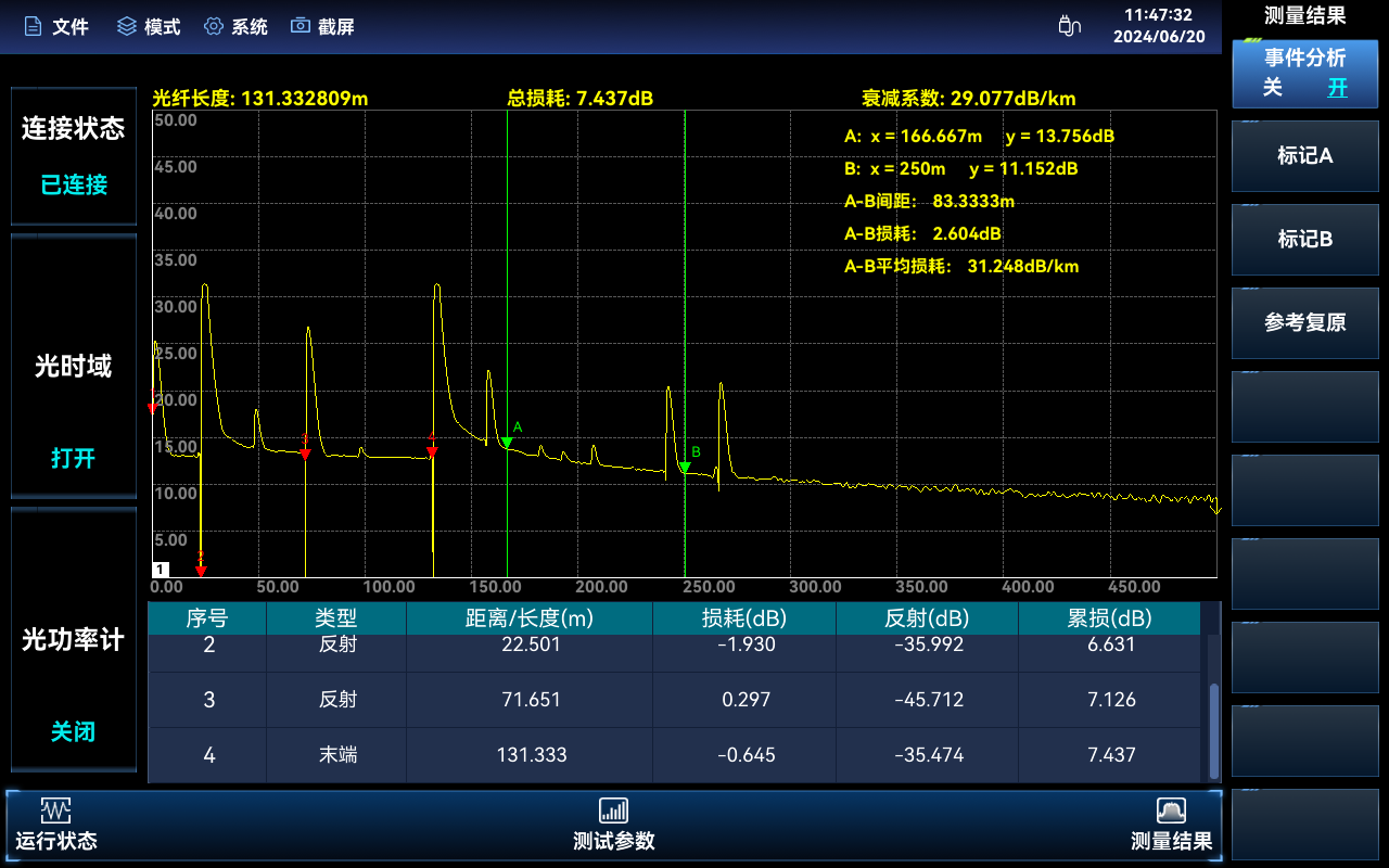 光時域反射計光纖類型G.652單模9/125,測量波長1310nm±20nm & 1550nm±20nm,動態(tài)范圍典型值38dB