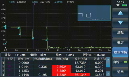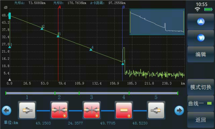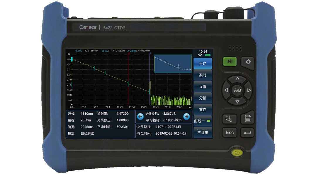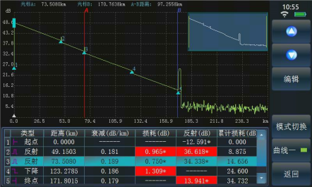 6422 的自動測試功能使得用戶無需了解更多的有關該儀器操作的細節(jié),測試步驟變得非常簡單,只需要將光纖接入產(chǎn)品對應 OTDR 端口、點擊【測試】按鈕即可,儀器會自動設置相應的測試條件并最終給出測試結果,包括測試曲線和事件列表等。