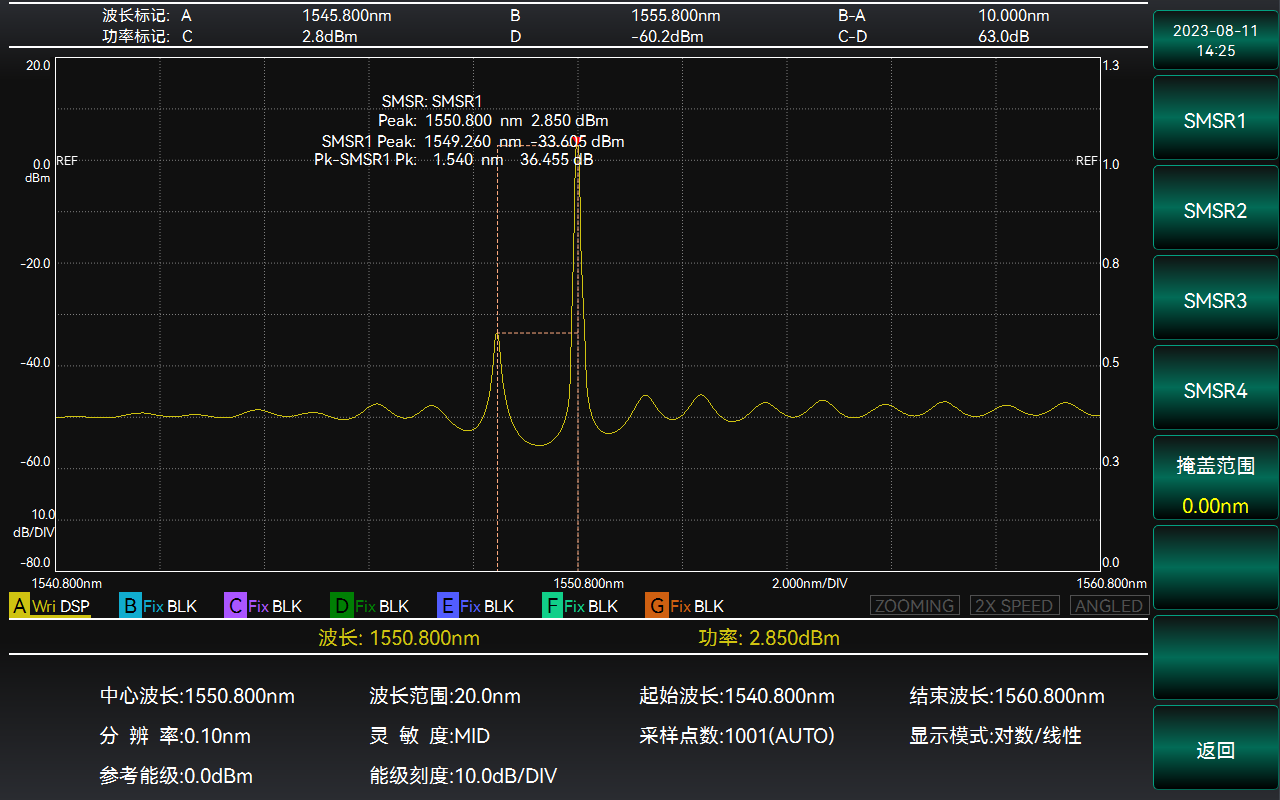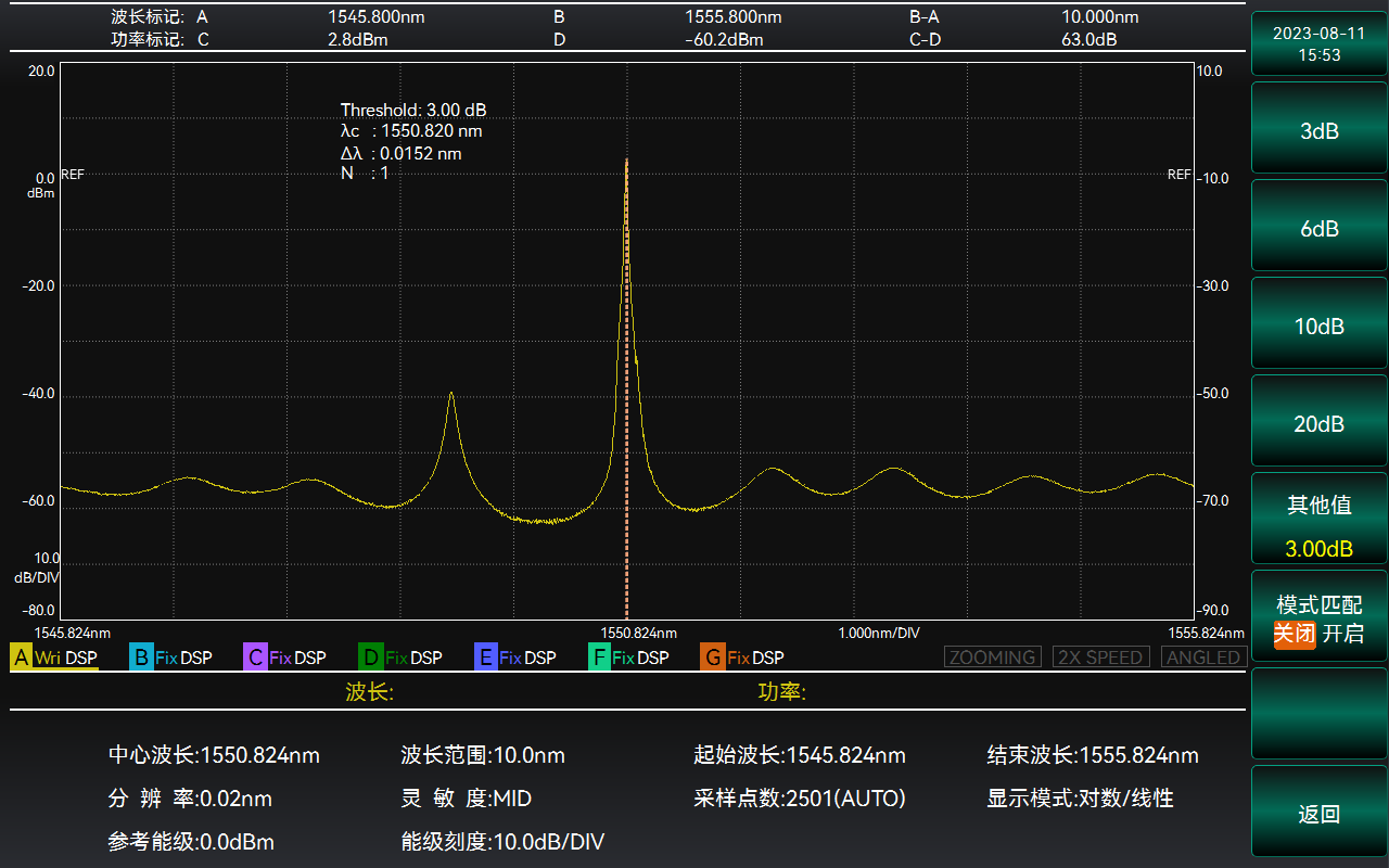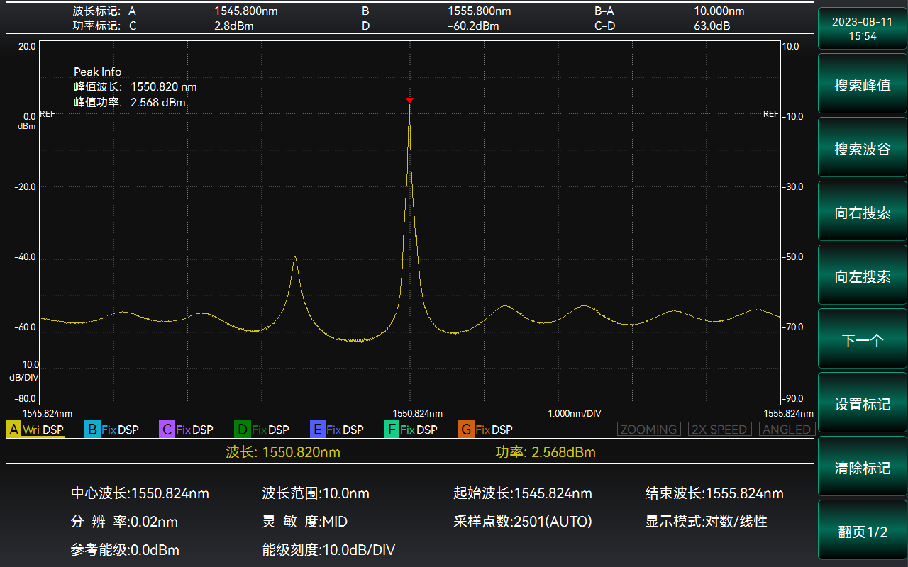 6362D光譜分析儀(光譜儀)具備多場景光譜分析功能,針對DFB-LD等單縱模激光光源,儀器提供閾值分析和邊模抑制比分析兩種分析方法,有效準確的評估單縱模待測光源的中心波長、光譜帶寬和邊模抑制比。