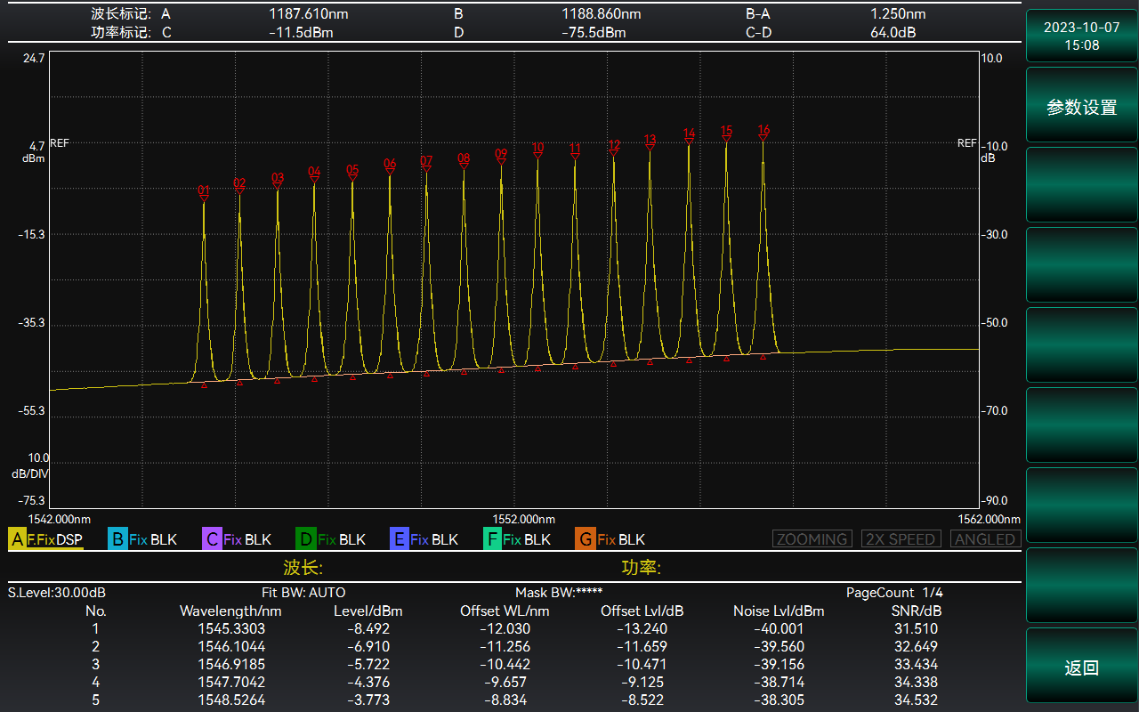除半導體激光光源光譜測量應用外,儀器還集成了光纖偏振模色散測量應用、波分復用應用、光纖放大器應用、波分復用濾波器應用、波分復用光纖放大器應用等光譜應用功能,下圖是典型的波分復用應用分析。