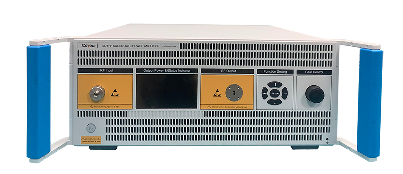 固態(tài)功率放大器前面板設(shè)計(jì)簡(jiǎn)潔明了,其中3871系列具有用戶界面友好及操作簡(jiǎn)單方便等特點(diǎn),工作頻率最高可達(dá)170GHz,可分頻段實(shí)現(xiàn)相應(yīng)工作頻率范圍內(nèi)輸入信號(hào)的功率放大。