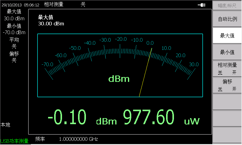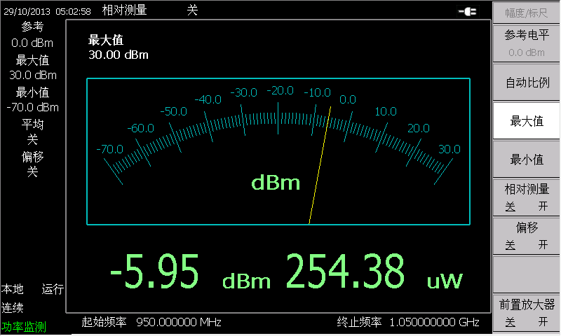 手持式微波綜合測試儀功率檢測頻率范圍為100kHz~20GHz,可通過頻譜輸入端口對被測信號進行功率測量。