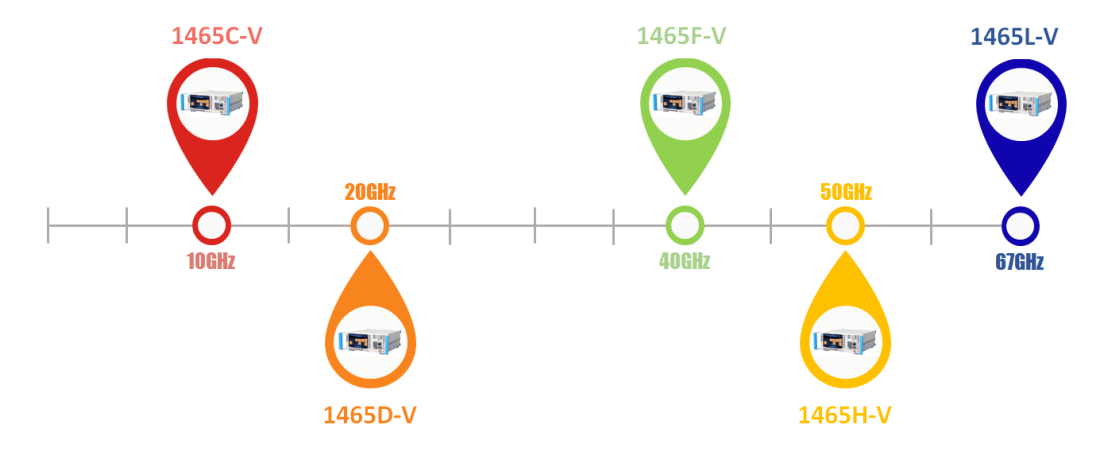 1465-V系列信號發(fā)生器能夠根據(jù)不同領(lǐng)域用戶的具體需求,提供頻率上限分別覆蓋10GHz/20GHz/40GHz/50GHz/67GHz的多種測試方案。尤其是1465L-V型信號發(fā)生器100kHz~67GHz的寬頻段覆蓋的特性可滿足絕大多數(shù)用戶的測試需求。
