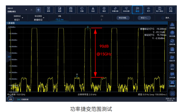 1452D/G捷變信號發(fā)生器可實現(xiàn)最大90dB動態(tài)范圍的功率捷變信號輸出,功率捷變時間≤150ns,能模擬實際戰(zhàn)場環(huán)境中回波信號受作用距離、探測對象、RCS起伏等因素所引起的回波功率差異,還能夠模擬通信信道變化所導(dǎo)致的信號幅度波動,從而為您提供更貼近實際的信號激勵和電磁環(huán)境模擬。