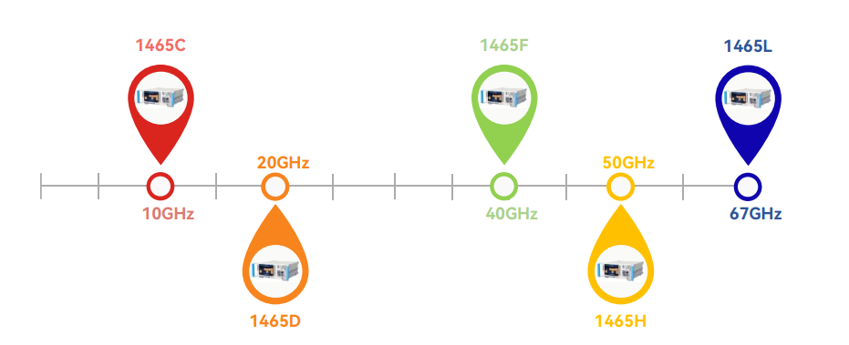 1465C/D/F/H/L頻率范圍為100kHz~10 GHz /20 GHz /40 GHz /50 GHz /67GHz,5種系列化型號,1465L可輸出頻率最高達(dá)70GHz。每種型號都有眾多的選件來進(jìn)行功能、性能擴(kuò)展。無論您需要計(jì)量級解決方案,還是基礎(chǔ)型信號發(fā)生器,無論您只需射頻波段測試信號還是要求信號頻率高達(dá)毫米波,總有一種型號適合您。
