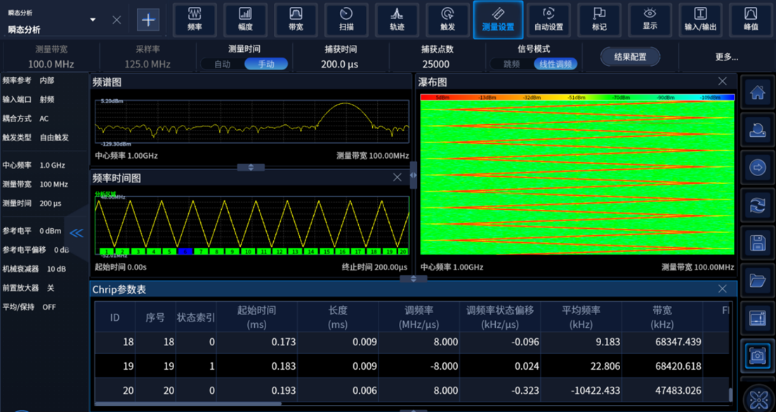 瞬態(tài)信號分析功能可以對捕獲數(shù)據(jù)的IQ幅度、相位、頻率以及功率等參數(shù)進(jìn)行分析,也可以對跳頻信號、調(diào)頻連續(xù)波信號進(jìn)行自動分析得到參數(shù)結(jié)果。
