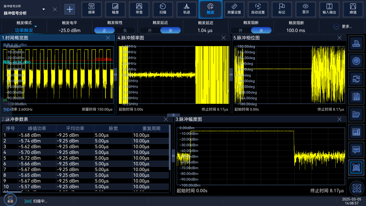支持脈沖信號頻譜、時域特性測試,可同時對脈寬、脈沖周期、脈沖上升和下降時間、脈沖內(nèi)功率下降、峰值功率、最小功率、頂值、底值、脈沖幅度、預(yù)沖、過沖、頻率誤差峰值、頻率誤差有效值、頻率偏移等脈沖參數(shù)進(jìn)行分析顯示。