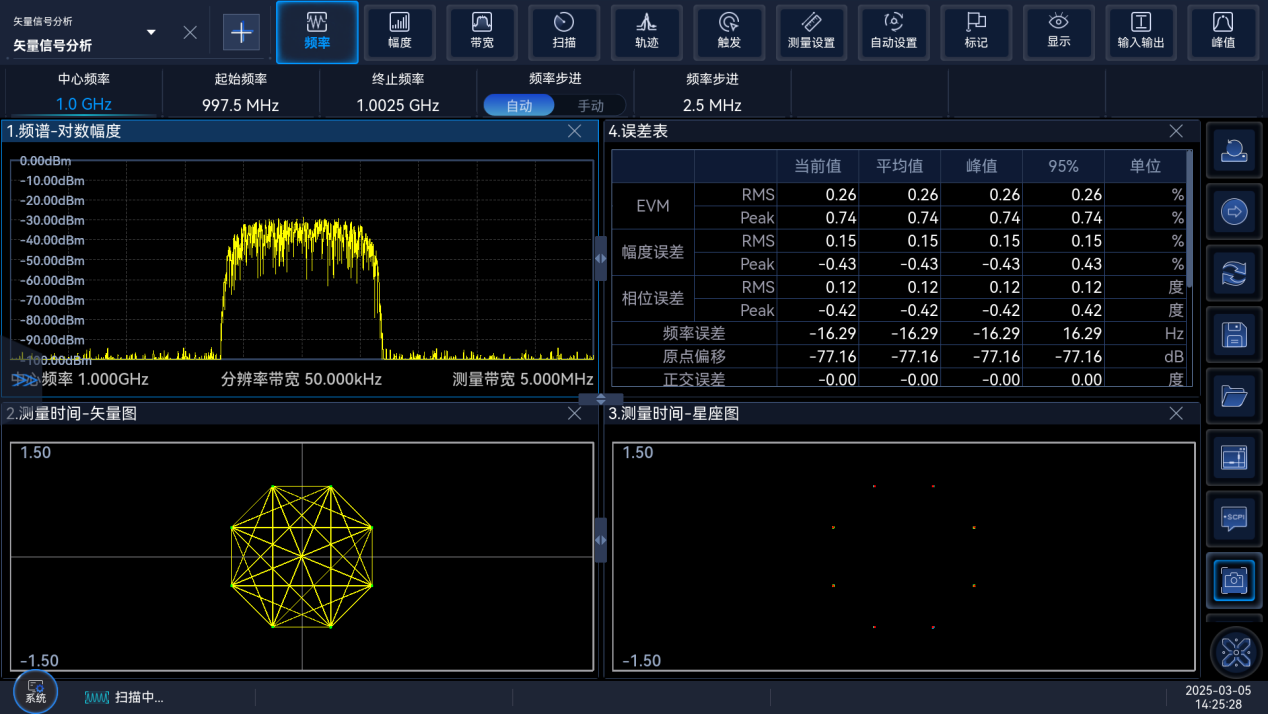 矢量信號分析功能,可對通用單載波、單調(diào)制數(shù)字調(diào)制信號進(jìn)行解調(diào),得到原始調(diào)制碼元序列和調(diào)制質(zhì)量分析結(jié)果??蓪?shù)字調(diào)制信號進(jìn)行時域、頻域和調(diào)制域的聯(lián)合分析,對信號質(zhì)量進(jìn)行精確測試,并輔助診斷增益不平衡、正交誤差、濾波錯誤和壓縮等信號問題。