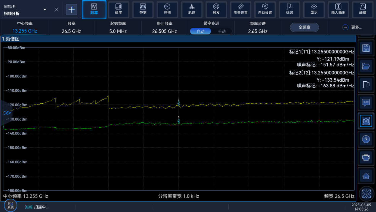 200MHz分析帶寬下無雜散動態(tài)范圍為-75dBc。