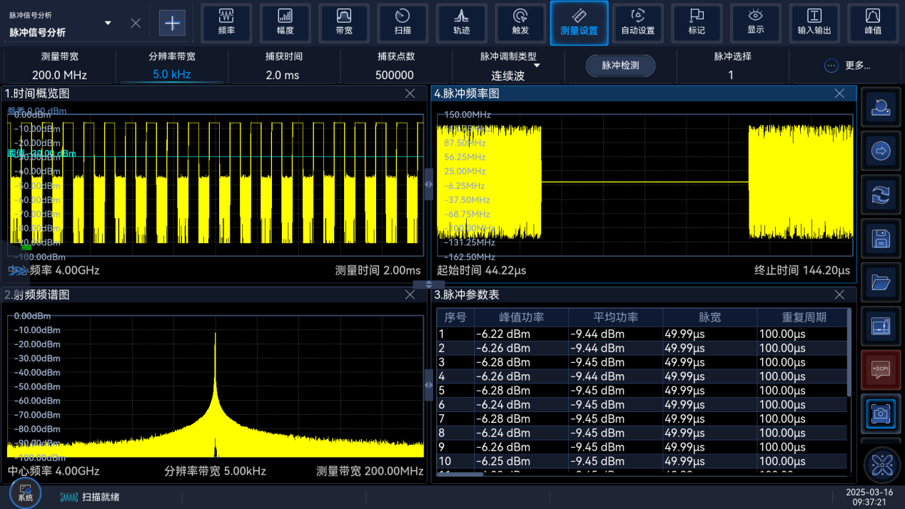 脈沖信號分析功能選件,可對脈沖調(diào)制信號進(jìn)行多層次的測量分析,并以頻譜、時間圖譜、參數(shù)表等多種顯示方式展現(xiàn),輔助進(jìn)行系統(tǒng)性能衡量和問題定位。