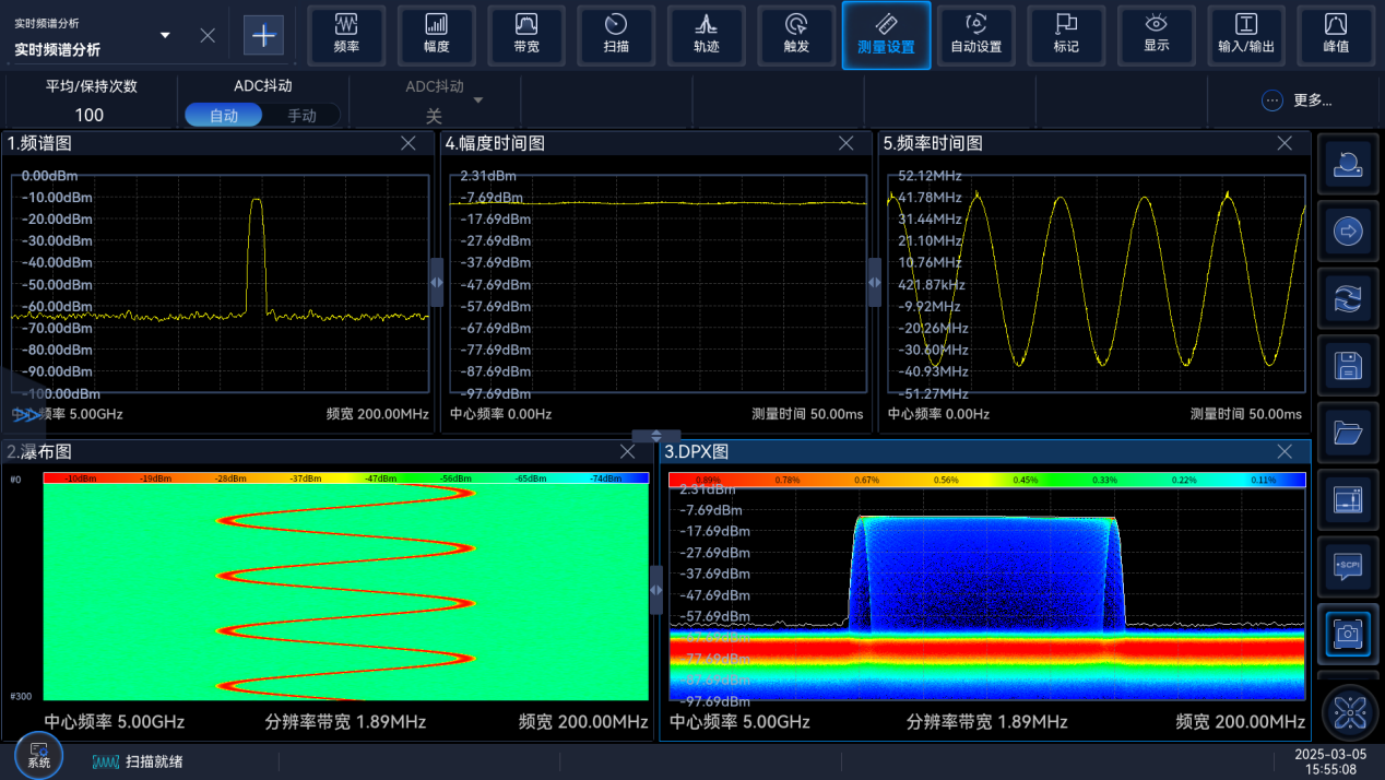 ● 具備數(shù)字熒光頻譜、無縫瀑布圖、瞬時頻譜、功率vs.時間、頻率vs.時間等多種圖表